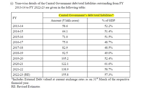 - The central government's debt stood at Rs 155.6 lakh crore or 57.1 per cent of the GDP at the end of March 2023.