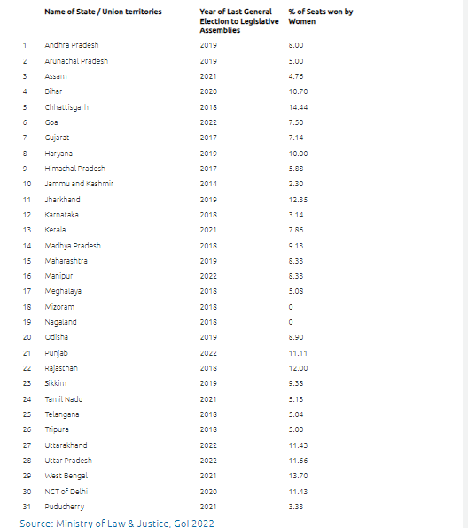 - குஜராத் - 182 உறுப்பினர்களைக் கொண்ட அதன் சட்டமன்றத்தில் வெறும் 8% பெண் சட்டமன்ற உறுப்பினர்களே தேர்ந்தெடுக்கப்பட்டுள்ளனர்.