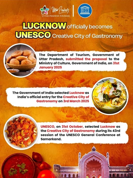 • Lucknow earned its place among the 70 Creative Cities of Gastronomy worldwide, joining the likes of Hyderabad, Al-Madinah Al-Munawwarah (Saudi Arabia), Kelowna (Canada), Quanzhou (China), and Zaragoza (Spain).