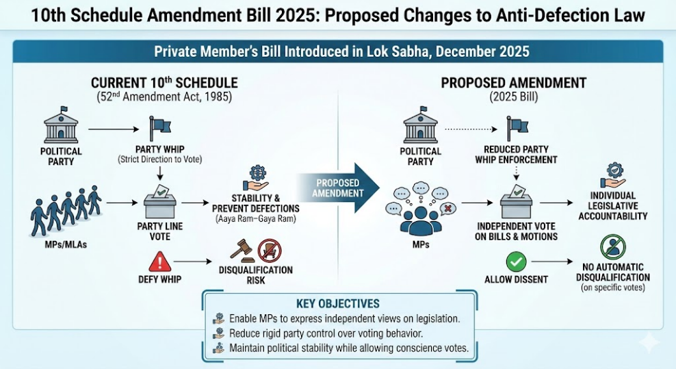 A Private Member’s Bill was introduced in the Lok Sabha in December 2025 to amend the 10th Schedule of the Constitution.
