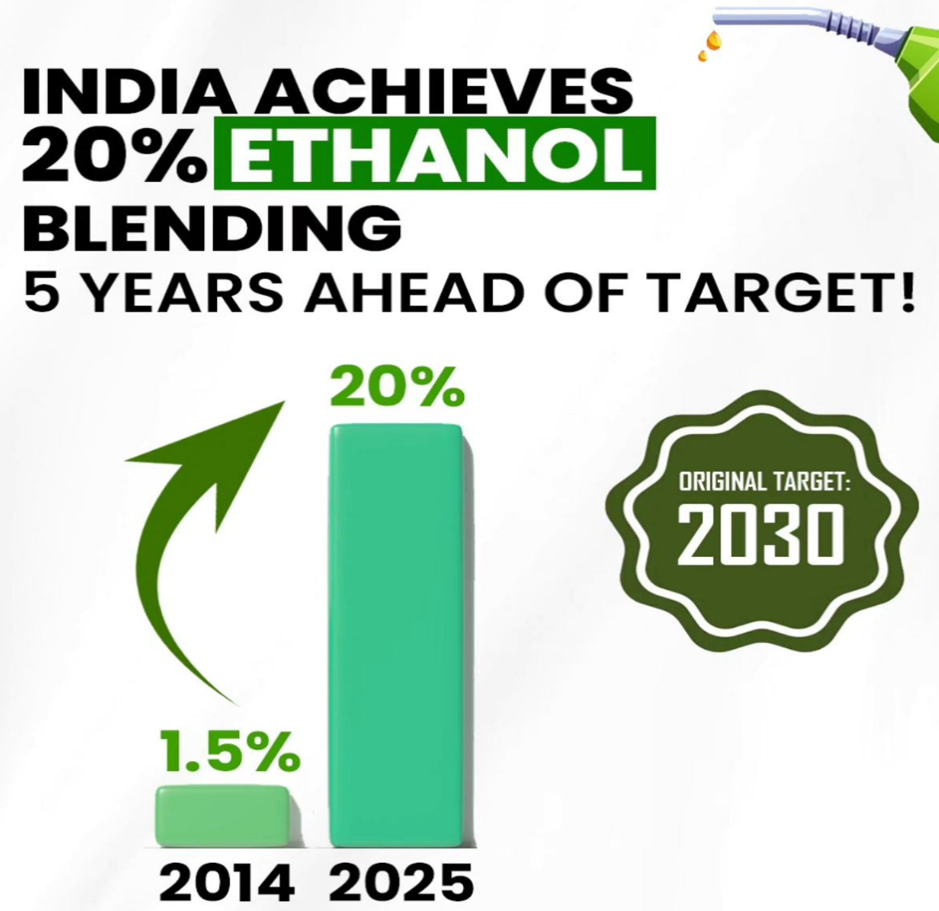 - In November 2025, India reached 20% ethanol blending in petrol.
