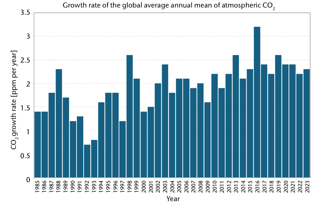 - The fastest annual CO₂ rise since modern records began in 1957.