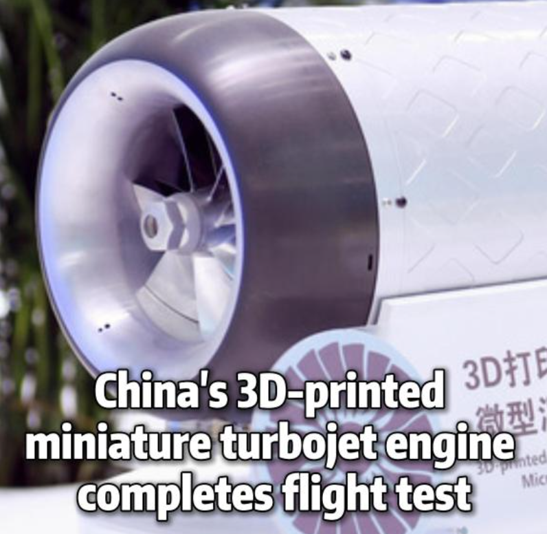 - China successfully tested a 3D-printed turbojet engine on a drone.