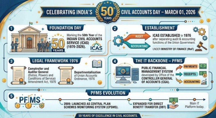 India has celebrated the 50th Civil Accounts Day on 1 March 2026 to mark the Foundation Day of the Indian Civil Accounts Service (ICAS).