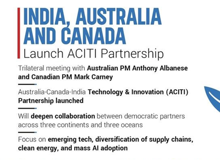 - India, Australia and Canada announced a new partnership called the Australia-Canada-India Technology and Innovation (ACITI) Partnership.