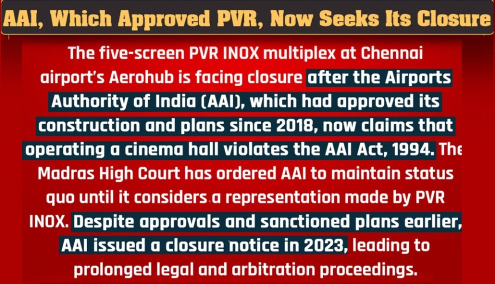 The Airports Authority of India stated that PVR Inox is only a sub-licensee and that the main contract with Meenambakkam Realty Private Limited stands terminated and is under arbitration.