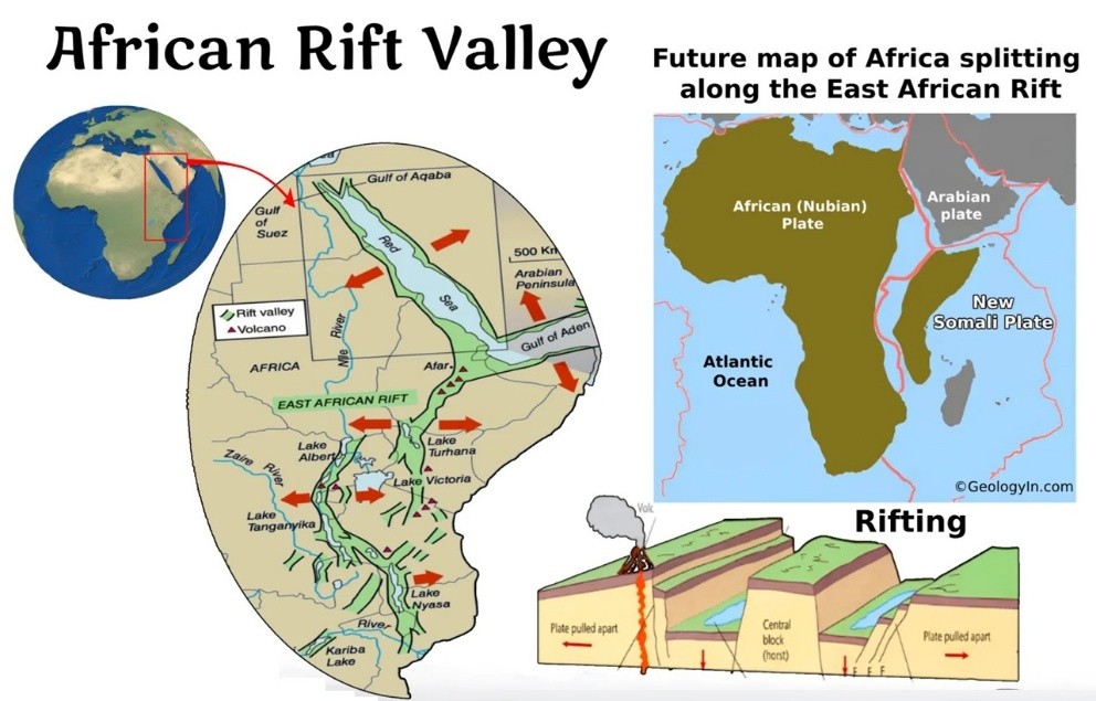 A New magnetic data analysed in 2025 show strong evidence of ongoing crustal separation in the Afar Region that may lead to Africa splitting into two landmasses.
