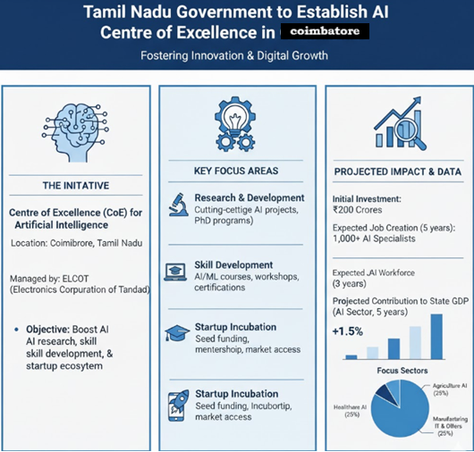 - The Tamil Nadu government will set up a Centre of Excellence for artificial intelligence in Coimbatore under a public-private partnership model.