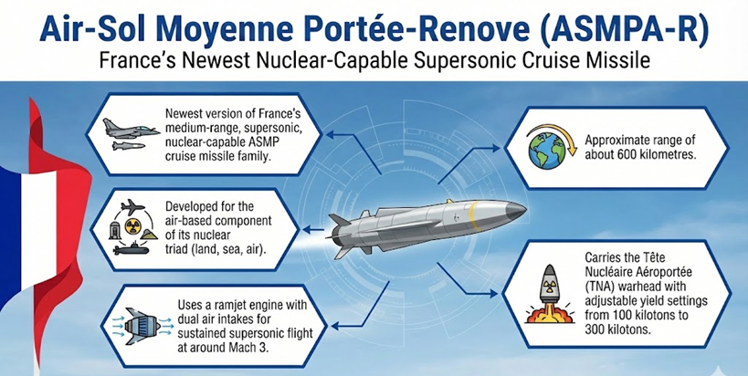 - The Air-Sol Moyenne Portée-Renove (ASMPA-R) is the newest version of France’s medium-range, supersonic, nuclear-capable ASMP cruise missile family.
