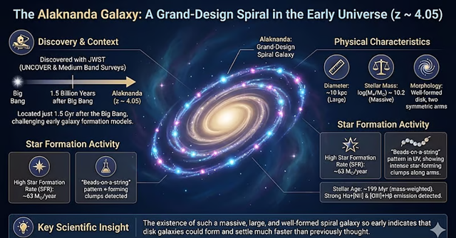 Earlier scientific models stated that early galaxies were expected to be chaotic and unstructured, but Alaknanda shows a well-formed spiral structure.