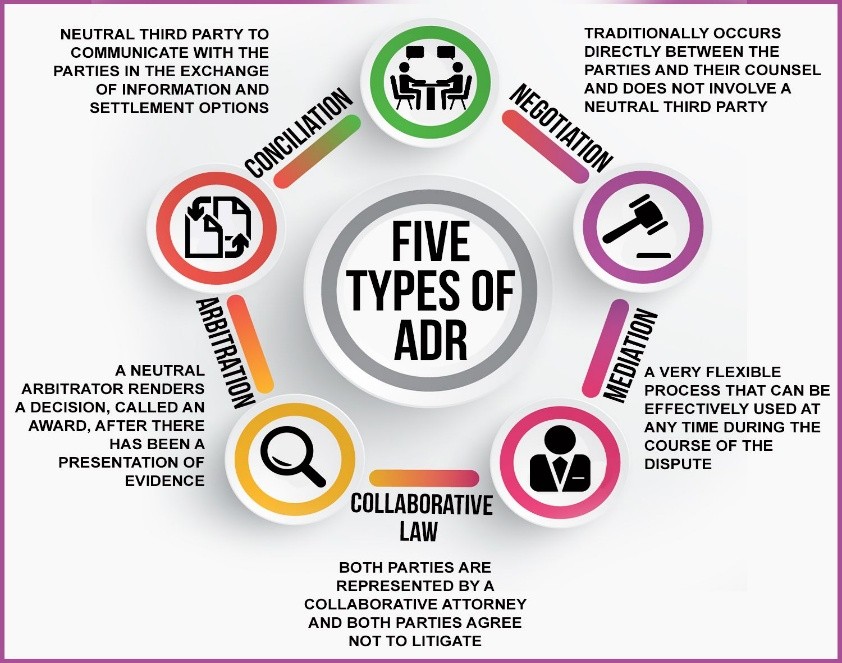 - Alternative Dispute Resolution (ADR) includes arbitration, conciliation, mediation, and judicial settlement through Lok Adalats.
