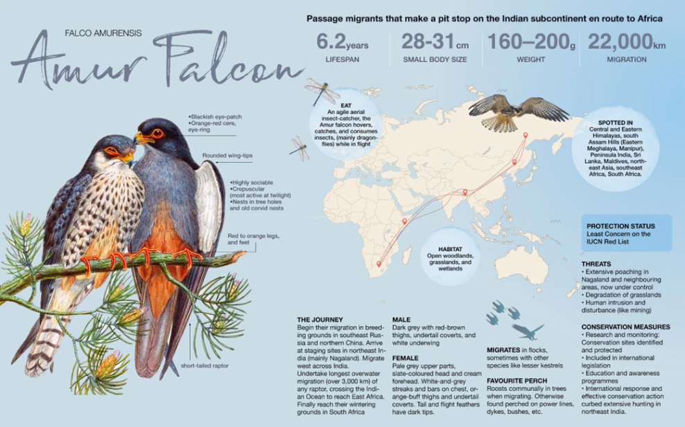 Amur falcons migrate 5,000 to 6,000 km nonstop from Northeast India to Africa every autumn.