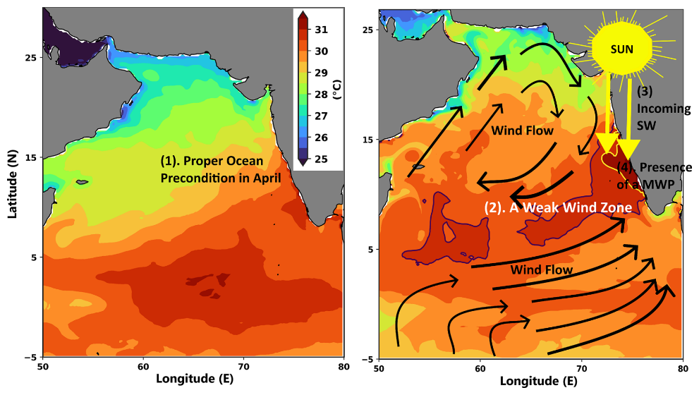 - The Arabian Sea Mini Warm Pool forms every April–May near the Kerala coast with sea surface temperatures above 30°C.