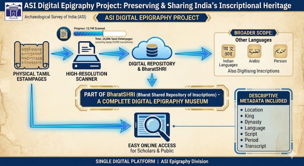 ASI holds 24,806 Tamil estampages, and scanning has been completed for 13,740, covering nearly 25,000 Tamil inscriptions.
