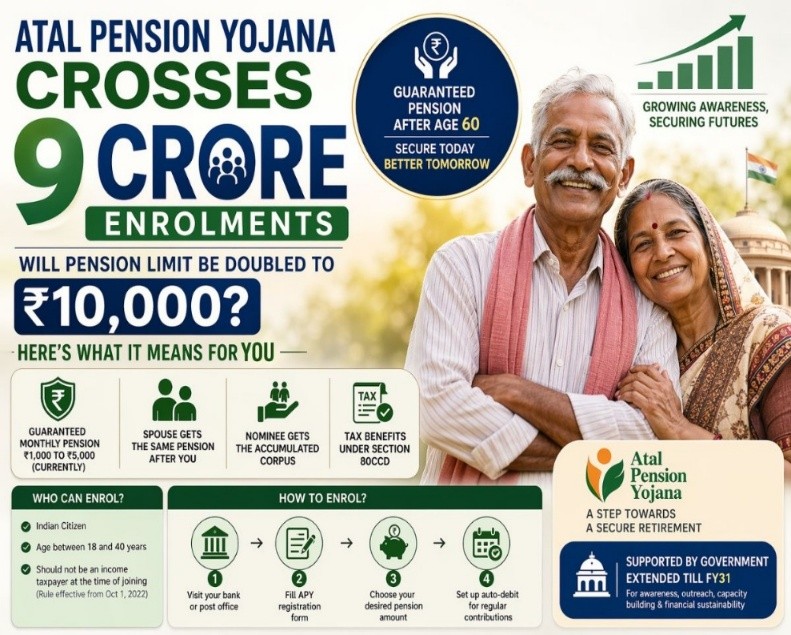 - Atal Pension Yojana has crossed 9 crore total enrolments as of April 2026.