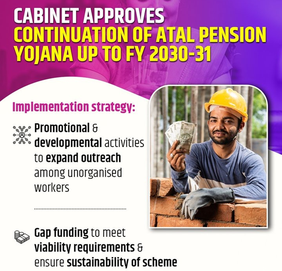 - The Union Cabinet has approved the extension of the Atal Pension Yojana (APY) until the financial year 2030–31.