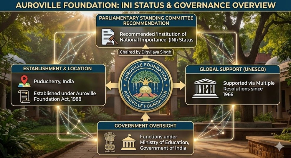 - A Parliamentary Standing Committee has recommended granting Institution of National Importance (INI) status to the Auroville Foundation.
