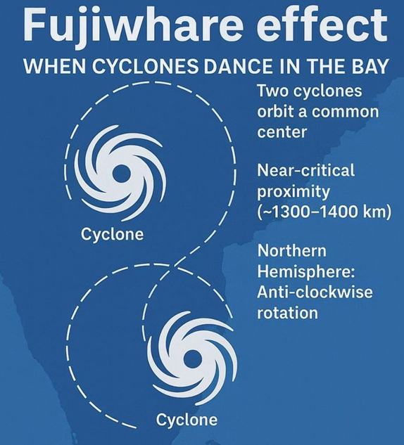 - The Fujiwhara Effect is when two nearby cyclones rotate around a common centre.