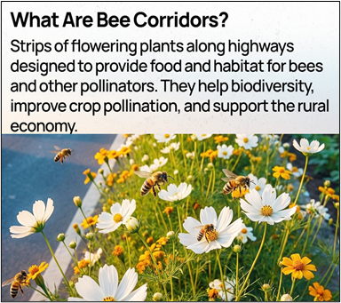 - The National Highways Authority of India will develop pollinator-friendly green corridors along highways.