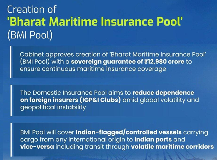 - The Government of India has approved the Bharat Maritime Insurance Pool with ₹12,980 crore guarantee.