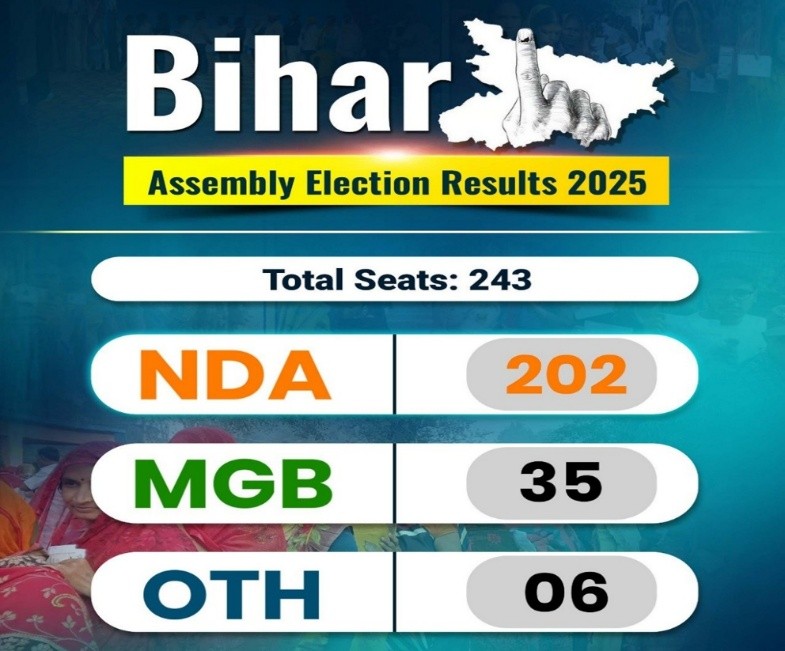 - The National Democratic Alliance (NDA) secured a decisive majority with 202 of 243 seats.