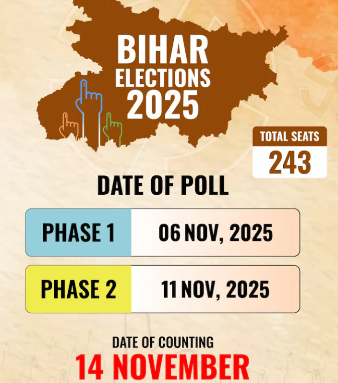 - Bihar will vote in two phases on November 6 and 11, and the results will be declared on November 14.