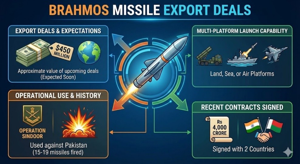 - India recently signed contracts worth about Rs 4,000 crore for BrahMos exports with two countries.