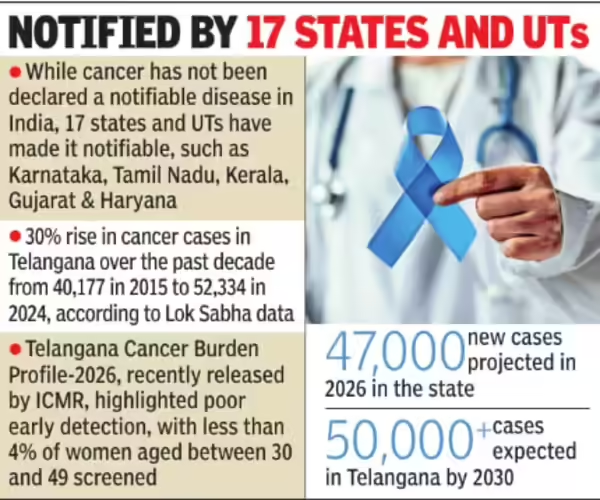 - The Telangana government declared cancer as a notifiable disease through a new government order.