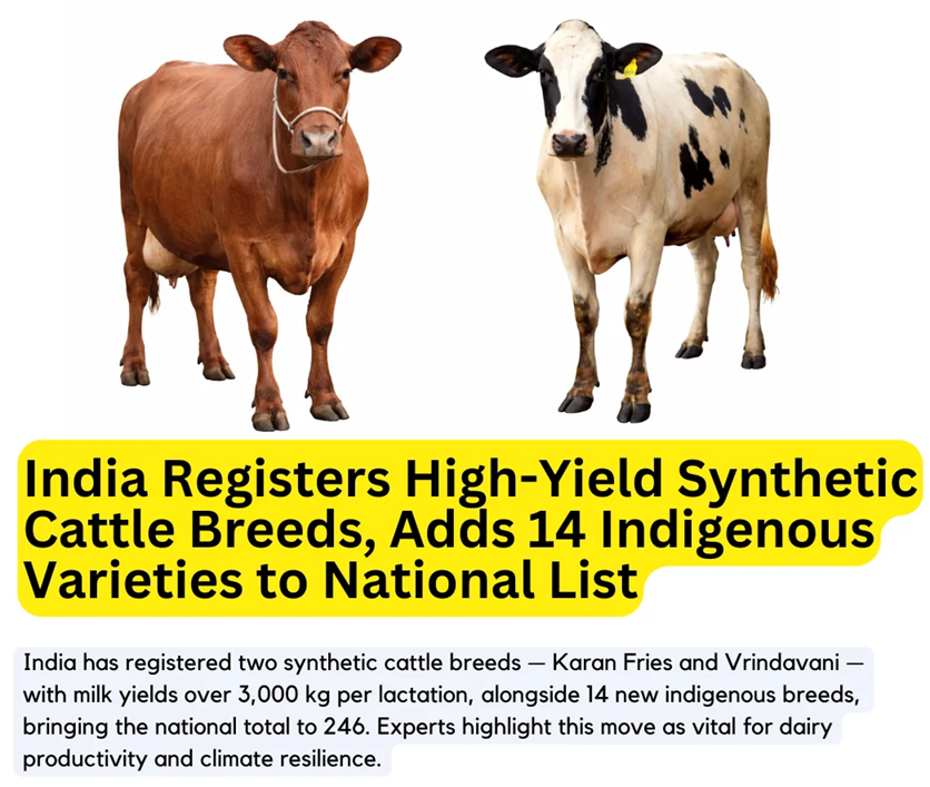 The Indian government has registered two high-yielding synthetic cattle breeds, Karan Fries and Vrindavani.