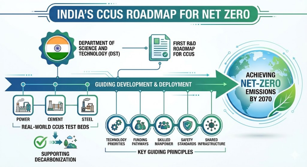 - It aims to support India’s climate goal of achieving Net-Zero emissions by 2070 by guiding CCUS technology development and deployment.