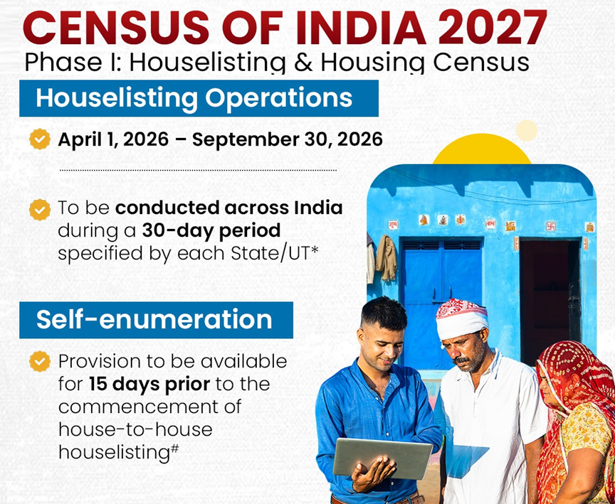 - The first phase of Census 2027, called House Listing Operations, will be held from 1 April to 30 September 2026 in all States and Union Territories.