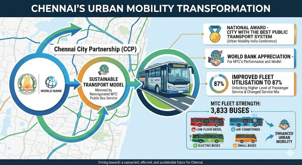The Chennai City Partnership (CCP) signed between the Tamil Nadu government and World Bank for creating a sustainable transport model by mirroring the public bus service getting reinvigorated through MTC.
