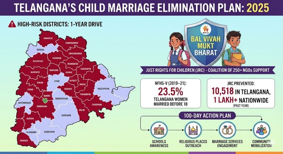 - Telangana has marked 26 high-risk districts for an intensive child marriage elimination drive within one year.