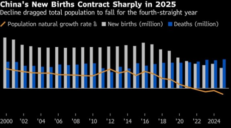 - China’s population declined again in 2025 despite new birth incentive policies.