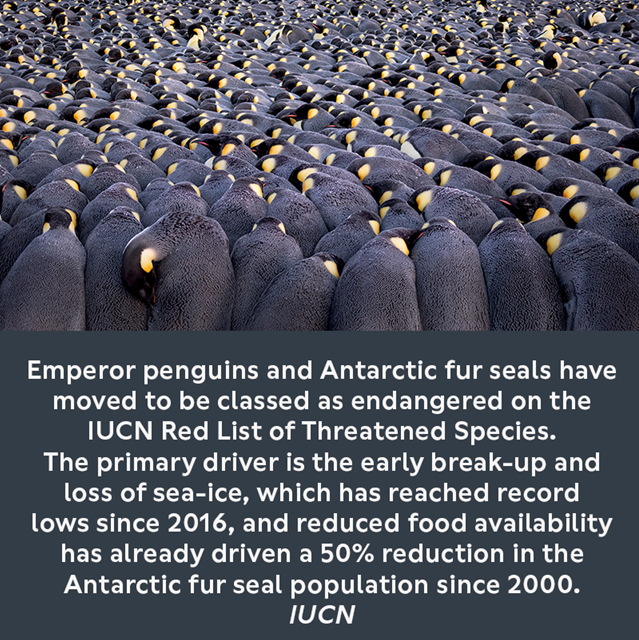 Emperor penguin (Aptenodytes forsteri) is now Endangered, with its population expected to decline by half by the 2080s due to sea-ice loss.