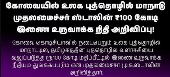 Tamil Nadu Chief Minister announced a ₹100 crore co-creation fund at the Global Startup Summit held in Coimbatore.