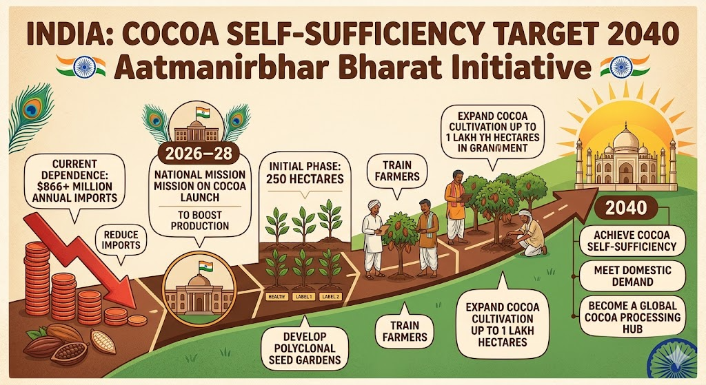 - India has launched a roadmap to achieve cocoa self-sufficiency by 2040 under the Aatmanirbhar Bharat.