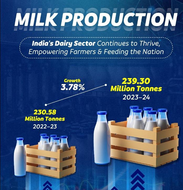 - With milk production rising from 146 million tonnes in 2014-15 to 239 million tonnes in 2023-24.