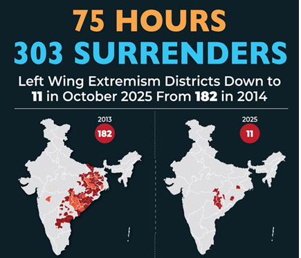• In 2025, a record 312 LWE cadres were eliminated, including the General Secretary and 8 other senior leaders of the Communist Party of India (Maoist).