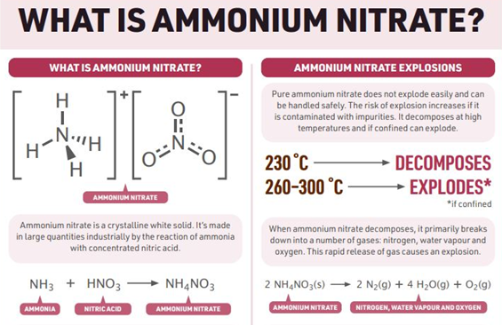 Ammonium nitrate is an odourless, white crystalline chemical that is commonly used to make fertiliser and explosives.