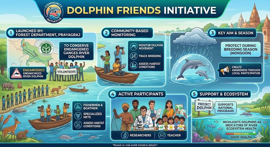 - The Forest Department in Prayagraj launched the Dolphin Friends volunteer network to conserve the endangered Ganges River dolphin.