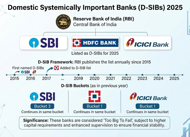 - The RBI has listed SBI, HDFC Bank and ICICI Bank as Domestic Systemically Important Banks (D-SIBs) for 2025.
