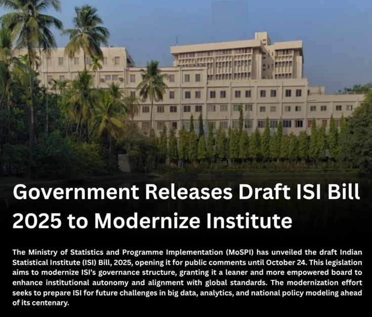 - The Ministry of Statistics and Programme Implementation (MoSPI) released the draft Indian Statistical Institute (ISI) Bill, 2025.