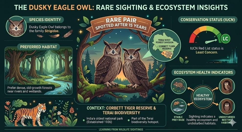 A rare pair of Dusky Eagle Owls has been spotted in the Phato tourism zone of the Terai West forest division near Corbett Tiger Reserve, Uttarakhand, after 15 years.