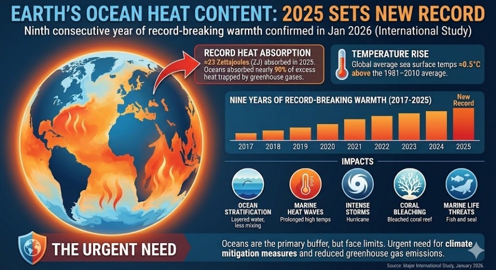 Earth’s ocean heat content (OHC) has set a new record in 2025 by absorbing an additional ~23 zettajoules (ZJ) of heat.