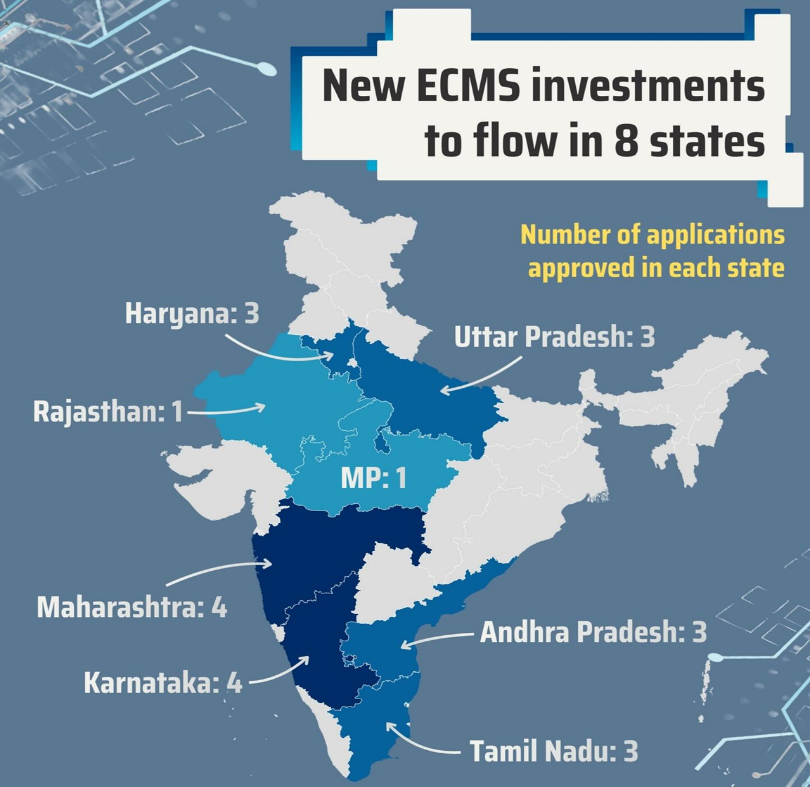 The Ministry of Electronics and Information Technology (MeitY) approved 22 new projects under the Electronics Components Manufacturing Scheme (ECMS) in the third tranche.