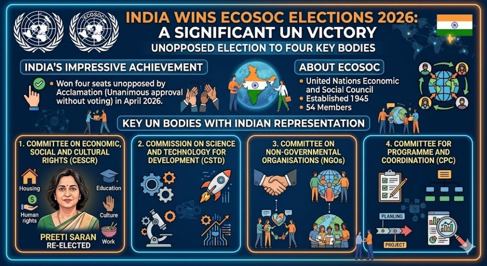• India won four seats unopposed in the United Nations Economic and Social Council elections in April 2026.