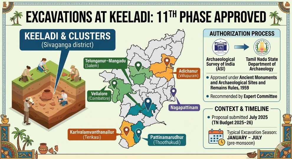 The Archaeological Survey of India (ASI) has permitted the Tamil Nadu State Department of Archaeology to conduct the 11th phase of excavations at Keeladi and seven other sites.