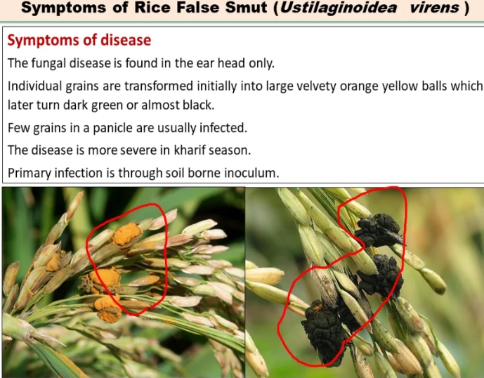 - False smut (haldi rog) is a fungal disease in rice caused by Ustilaginoidea virens, infecting crops during flowering.
