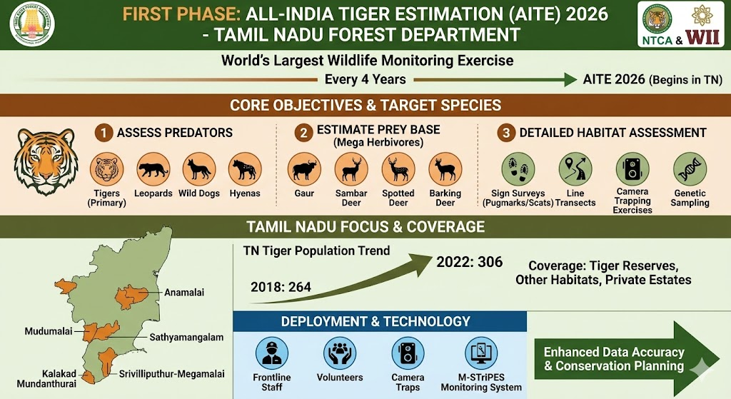 - The Tamil Nadu Forest Department has announced that the first phase of the All-India Tiger Estimation (AITE) 2026 will begin.